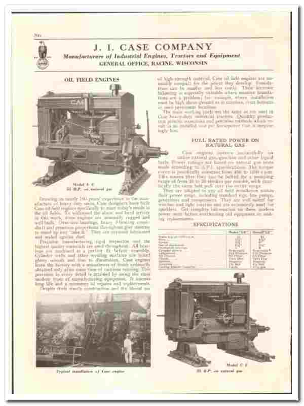 Manufacturers of Oilfield Engines. Drawing on nearly 100 years experience in the manufacture of heavy duty units, Case designers have built Case oilfield engines specifically to meet today's needs in the oil fields. To withstand the abuse and hard service in this work, these engines are unusually rugged and well-built. Over-size bearings, heavy 3-bearing crankshaft and generous proportions throughout give stamina to stand up and 'take it'. They are pressure lubricated and sealed against dust. Case engines operate successfully on either natural gas, gasoline or other liquid fuels .