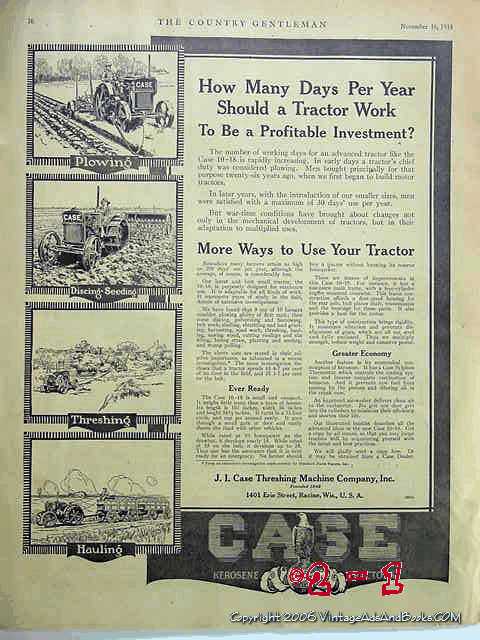 Original vintage magazine ad for the J. I. CASE THRESHING MACHINE COMPANY, INC. Main office and factory was located in Racine, WI. Plowing, Discing, Seeding, Threshing, Hauling Tractors. Old 1918 farm tractor advertisement.