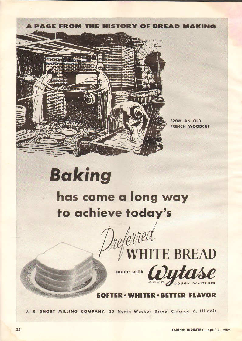 Original commercial bakery trade magazine vintage ad for J R SHORT MILLING COMPANY. Main office and factory was located in Chicago, IL. Wytase dough whiter for softer, whiter bread. Baking has come a long way. Featured is a French woodcut about the history of bread making. 1959 unique old cooking industry advertisement. There is bleeding from another page on the upper right edge, and a small moisture mark on the bottom left corner as seen in the scan.
