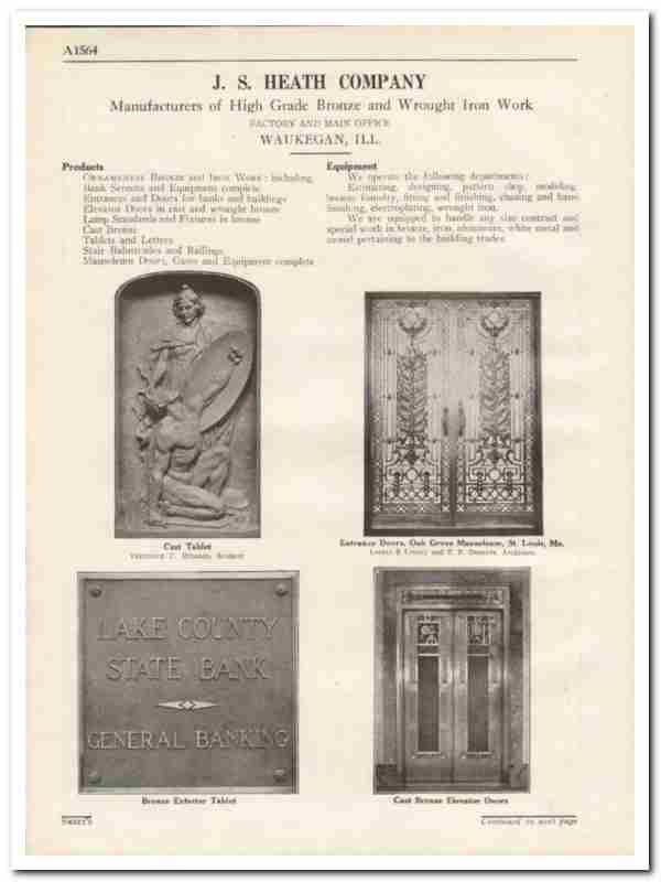 Original metal trade vintage catalog for J. S. HEATH COMPANY. main office and factory was located in Waukegan, IL. Manufacturers of bronze and wrought iron work. Ornamental pieces including bank screens, entrances & doors, elevator doors, land standards, tablets, stair balustrades & railings, mausoleum doors, gates and equipment. Shown is a cast tablet, Frederick C. Hibbard, Sculptor. Entrance doors to Oak Grove Mausoleum in St. Louis, MO., Lovell & Lovell and T. P. Barnett, Architects, safe deposit screen, grills and rail in Central Manufacturing District Bank, Chicago, IL. Unbound from a large 1931 architectural catalog, this unique old two page technical brochure would display beautifully matted and framed. A fantastic addition to your retro metal library.