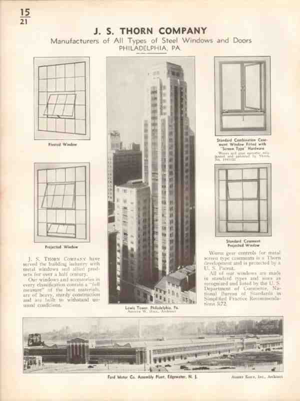 Original old building material vintage catalog J. S. THORN COMPANY. Main office and factory was located in Philadelphia, PA. Manufacturers of All Types of Steel Windows and Doors. Lewis Tower, Arthur Hall, Architect, Ford Motor Company Assembly Plant, Edgewater, NJ, Albert Kahn Architect. Pivoted Window, Projected Window. Disbound from a large 1938 construction book, this unique one page technical data specification sheet would display wonderfully matted and framed.