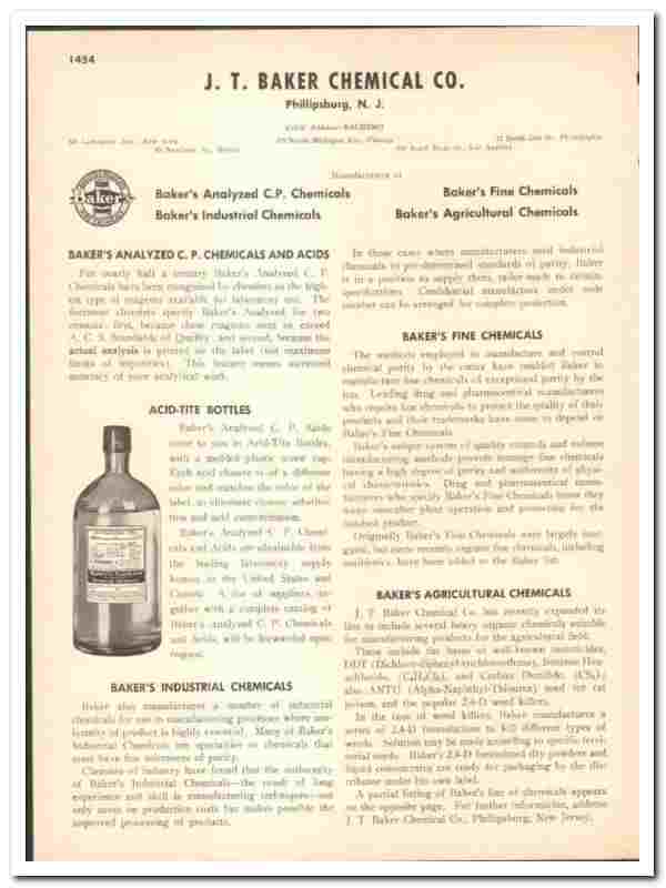 Original 1947 industrial trade vintage catalog for the J. T. BAKER CHEMICAL COMPANY. Main office and plant were located in Phillipsburg, NJ.