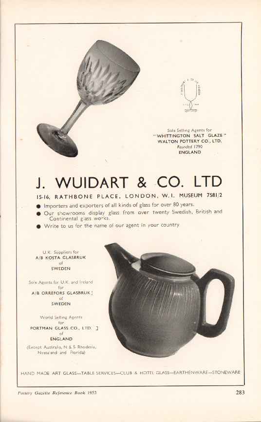 Original pottery vintage ad for J. WUIDART & COMPANY LTD. Main office and factory was located on Rathbone Place, London, England. Importer, Exporter for Whittington Salt Glaze, Walton Pottery, and all kinds of glass. Showrooms display glass from over twenty Swedish, British and Continental glass works. This old 1953 one page ceramics trade magazine advertisement would display beautifully matted and framed.