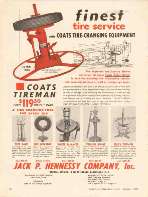 Original old service station trade magazine vintage ad for JACK P HENNESSY COMPANY, INC. Main office and factory was located in Englewood, NJ. Finest Coats Tire Changing Equipment. Tool rack, spreader, wheel balancer. This unique old 1956 car tires advertisement would display beautifully matted and framed.