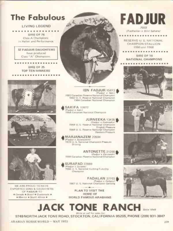 Original old equestrian trade magazine vintage ad for JACK TONE RANCH in Stockton, CA. Fadjur 7668, sire Fadheilan dam Bint Sahara. Arabian horse living legend. Sire of 76 Class A Champions, sire of 10 National Champions, sire of 25 Top Ten Winners. 32 daughters have produced Class A Champions. Ibn Fadjur, dam Saki, Jurneeka dam Fadneeka, Marjanazem dam Suranazem, Antonette dam Farzanah, Surafad, dam Suralee, and Fadalan dam Fellany. This unique 1972 Arabian horses breeding advertisement would display beautifully matted and framed.