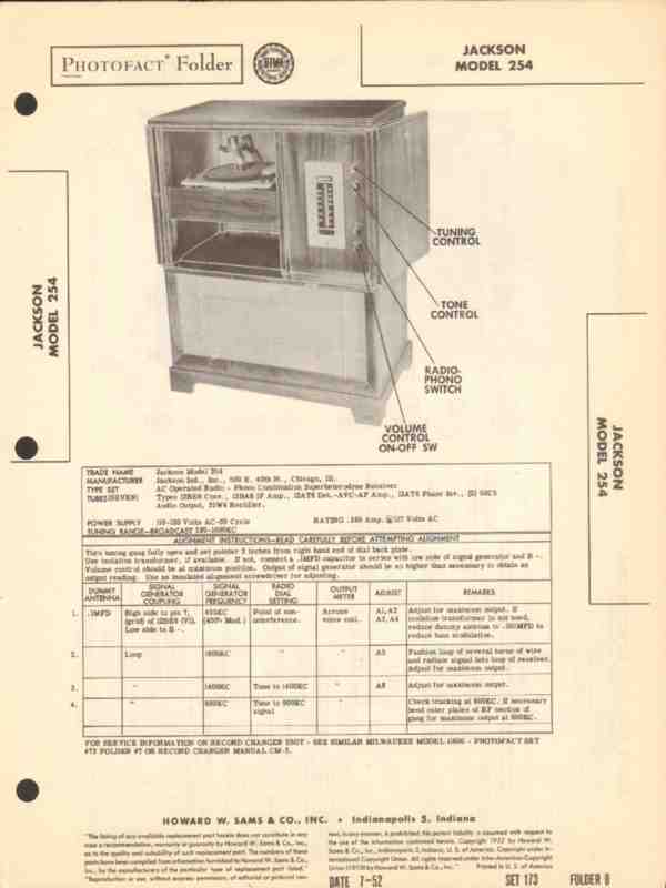 Vintage JACKSON model 254 seven tube combination Superheterodyne. AM radio receiver with phonograph record player. Original old Sams Photofact manual includes schematic, layouts, alignment info, voltage & resistance test chart, repair parts list. 4 pages. Dated 1952. Jackson Industries, INC., of Chicago, IL. This manual would make a sensational accompaniment to your vintage radio / audio equipment.