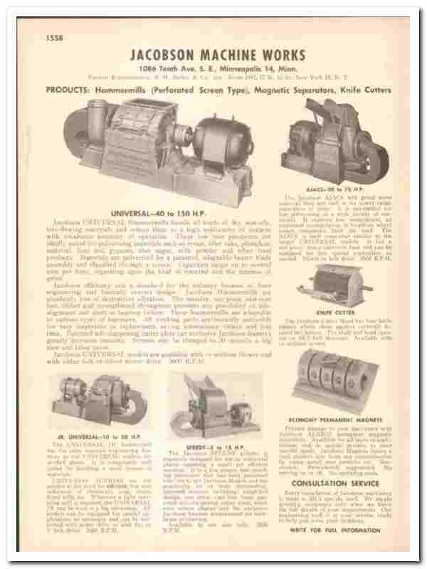 Original 1948 industrial trade vintage catalog for JACOBSON MACHINE WORKS, INC. Main office and plant were located at 1086 Tenth Avenue SE, Minneapolis, MN.