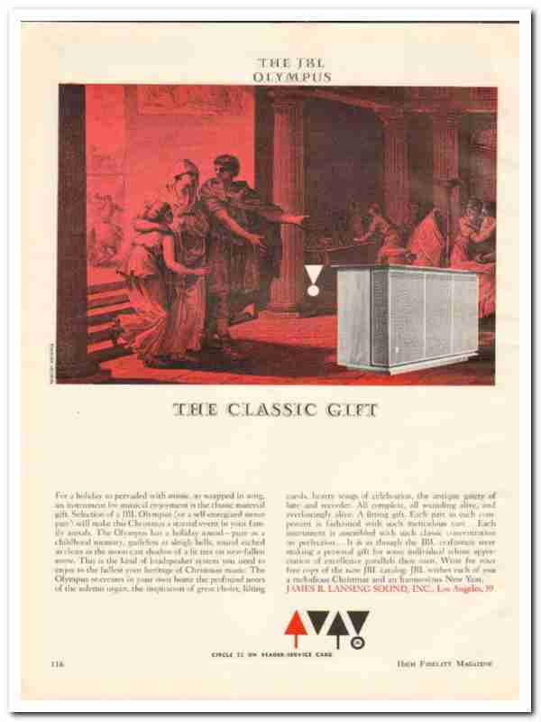 Original stereo vintage ad for the JAMES B LANSING SOUND, INC. Main office and factory was located in Los Angeles, CA. Classic JBL Olympus speaker will make this Christmas a starred event in your family annals. The Olympus has a holiday sound, pure as a childhood memory, guileless as sleigh bells, sound etched as clean as the moon-cast shadow of a fir tree on new-fallen snow. This unique old one-page 1964 high fidelity stereo equipment component trade magazine advertisement would display beautifully matted and framed. It would make a nice accompaniment to your vintage stereo.