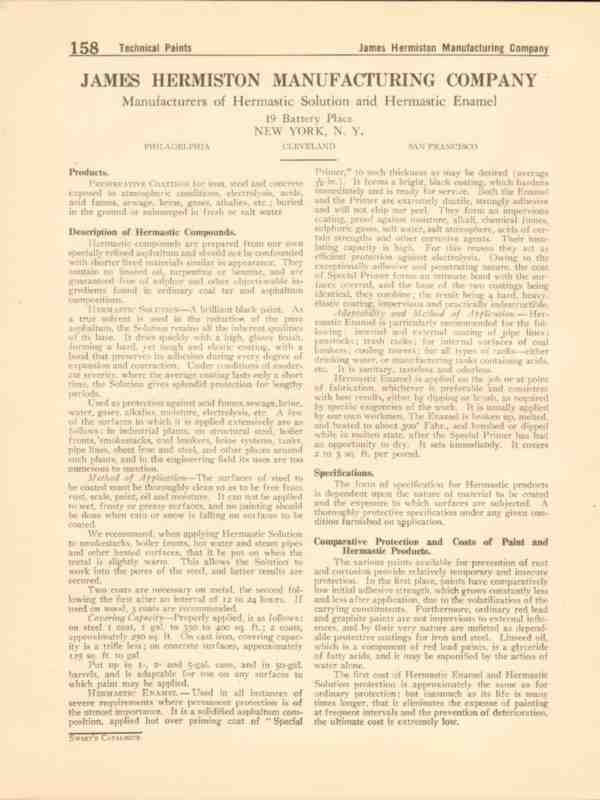 Original paint trade vintage catalog for JAMES HERMISTON MANUFACTURING COMPANY. Main office and factory was located at 19 Battery Place, New York City, NY. Manufacturers of Preservative coatings for iron, steel and concrete exposed to atmospheric conditions, electrolysis, acids, sewage, brine, gases, buried in the ground or submerged in fresh or salt water. Hermastic Solution and Enamel. Unbound from a large 1916 engineering catalog, this unique old one page technical brochure would display beautifully matted and framed. A fantastic addition to your retro paint and coatings library. Page is detached and may contain a small amount of residual glue on edge.