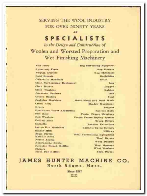 Original 1938 textile trade vintage ad for JAMES HUNTER MACHINE COMPANY. Main office and plant was located in North Adams, MA. (Since 1847).