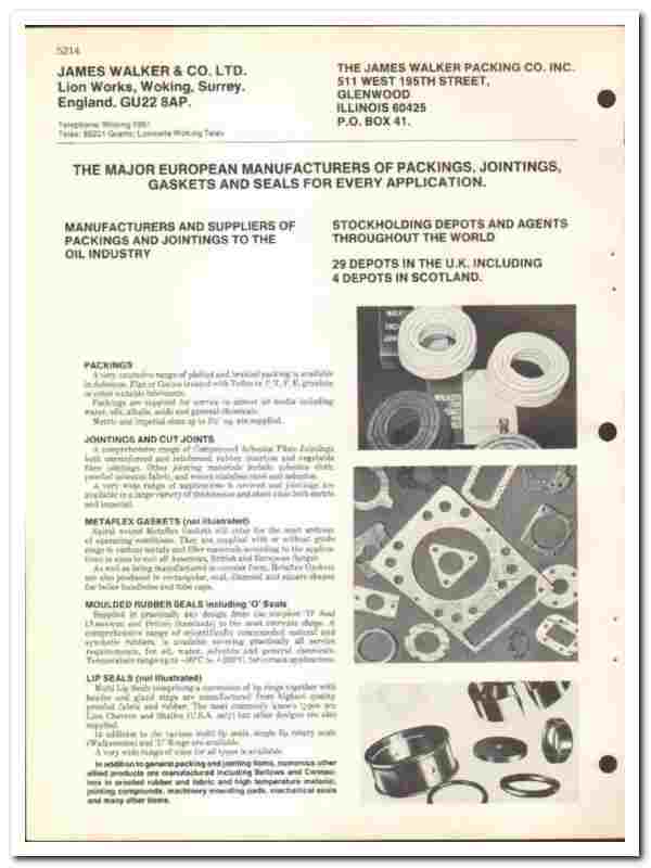 Original 1974 Oil and Gas trade vintage catalog for the JAMES WALKER & COMPANY, LTD. Main office and plant were located at Lion Works, Woking, Surrey, England. Also at James Walker Packing Company, (James Walker Manufacturing Company). 511 West 195th Street, Glenwood, IL.