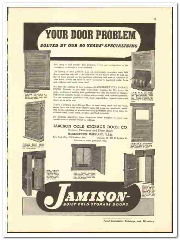 Original 1942 industrial door trade vintage catalog for the JAMISON COLD STORAGE DOOR COMPANY. Main office and plant was located in Hagerstown, MD.