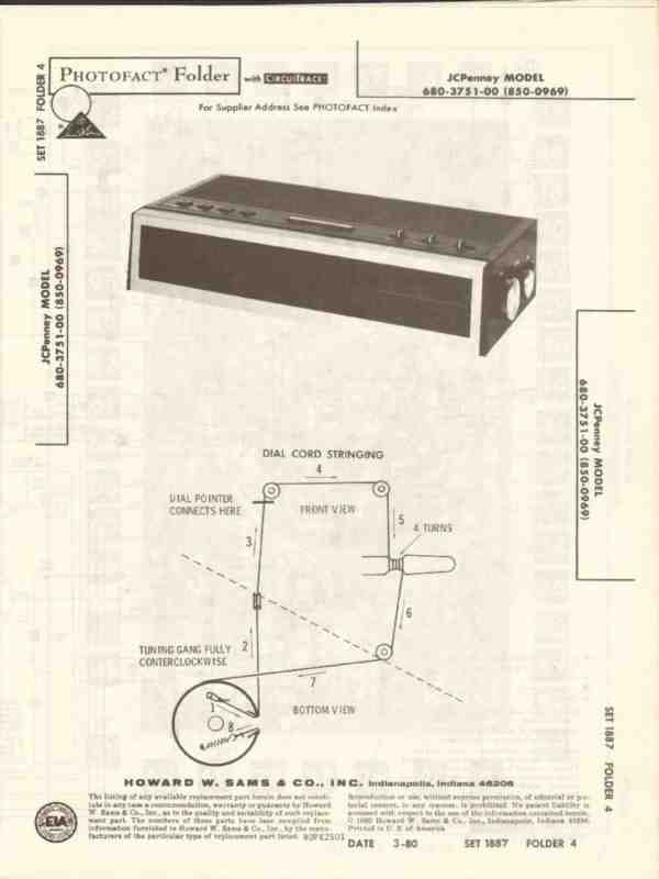 Vintage JCPenney model 680-3751-00 series 850-0969 AM FM clock radio. Original old Sams Photofact manual includes schematics, layouts, alignment, adjustments, parts list. 13 pages. Dated 1980.