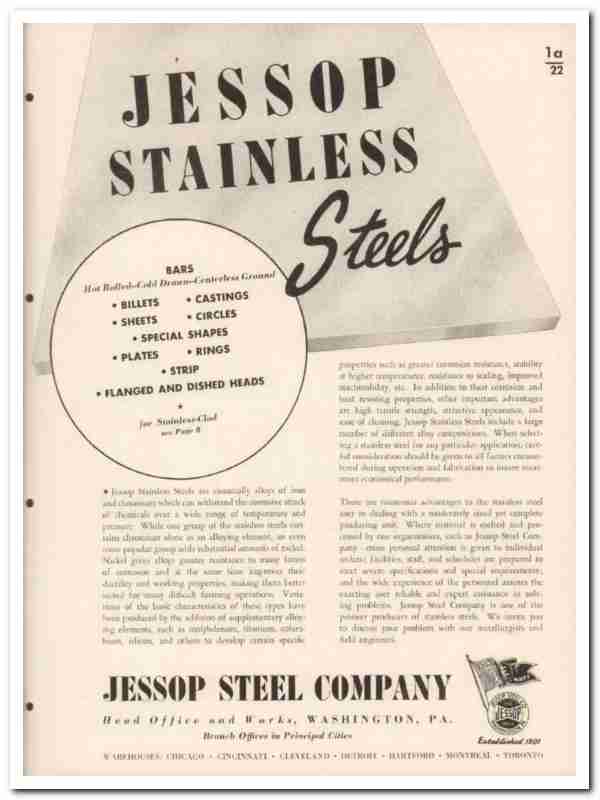 Original metal trade vintage catalog for JESSOP STEEL COMPANY.. Main office and works was located in Washington, PA.. Manufacturers of Stainless Steel alloys. Products include bars, billets, castings, sheets, circles, special shapes, plates, rings, strip, flanged and dished heads. Has numerous charts, illustrations and detailed specifications are provided. Unbound from a large wartime 1945 engineering catalog, this unique old eight page technical brochure would display beautifully matted and framed. A fantastic addition to your retro metal library. Pages may be detached and contain a small amount of residual glue on edge.