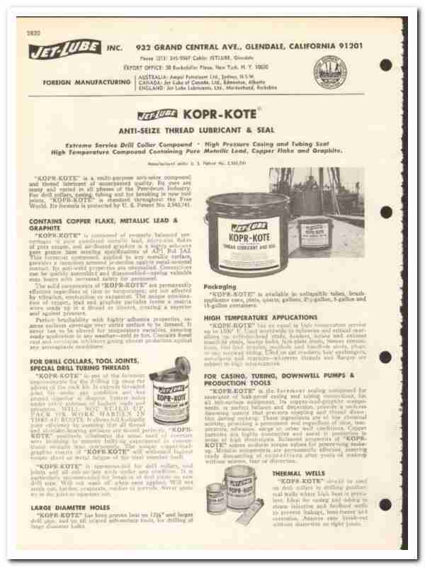 Products include Kopr-Kote anti-seize thread lubricant & seal, No 21 double-duty tool joint compound, No 20 moly spray air-dry lubricant, No 9 tool joint compound, Lead base drill collar compounds, Zinc base tool joint compounds, No 550 Molybdenized drill collar tool joint compound, API silicone & modified thread compounds, No 50-G graphite thread seal compound, SS-30 copper anti-seize compound, Thick or Thin joint paste & Sealing Compound, TF-15 Teflon thread sealing compound, TF-5000 Teflon lubricating sealant, CB-2 hi-temp crown block lubricant, No 202 super Moly-lith, MP-50 Moly-paste, Perma-Film protective coating & metal preservative, R-T tool joint compound, Applicator, WLD wire line lubricant, Easy-Clean rig washing & steam cleaning compound and Waterless hand cleaner, all are fully featured.