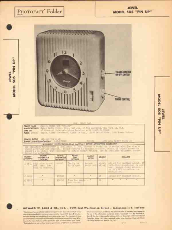 jewel model 505 pin-up am radio receiver clock sams photofact manual