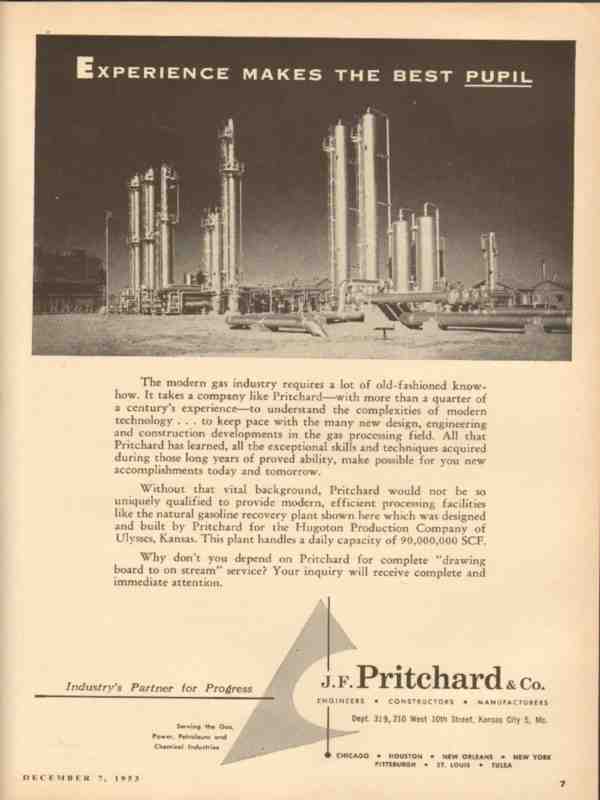 Original oil and gas trade magazine vintage ad for J. F. PRITCHARD & COMPANY. Main office and factory was located in Kansas City, MO. Experience Makes the Best Pupil. The modern gas industry requires a lot of old fashioned know how. Engineers, Constructors, Manufacturers. Unique 1953 old petroleum industry magazine advertisement. Nice graphics.
