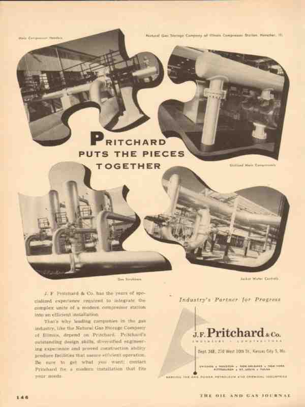 Original oil and gas trade magazine vintage ad for J. F. PRITCHARD & COMPANY. Main office and factory was located in Kansas City, MO. Pritchard Puts The Pieces Together. Natural Gas Storage Company of Illinois Compressor Station, in Herscher, IL. Unique 1954 old petroleum gas refining industry magazine advertisement.