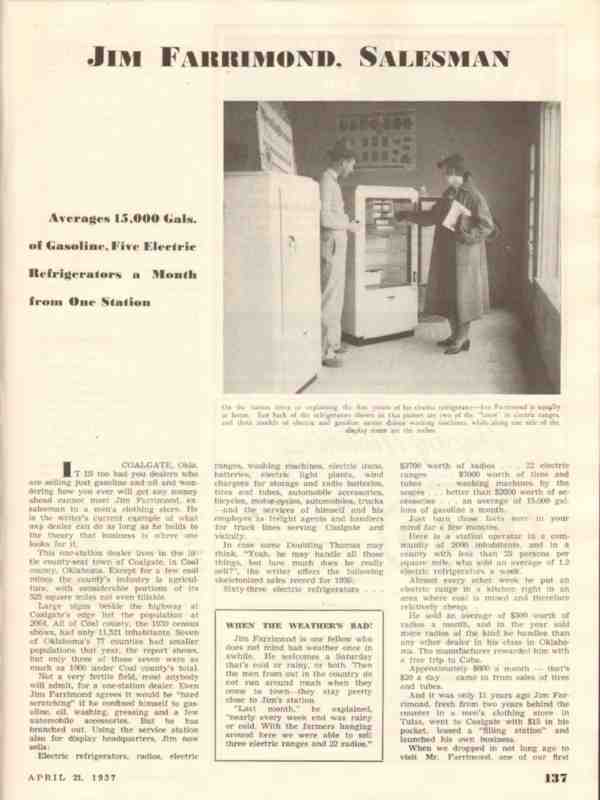 Original old petroleum trade magazine vintage article for JIM FARRIMOND gas station in Coalgate, OK. From salesman in clothing store to starting his own filling station, it is used as display base for selling electric refrigerators, radios, ranges, washing machines, irons, batteries, light plants, wind chargers, tires and tubers, automobile accessories, bicycles, trucks, his his employees as freight agents and handlers for truck lines. This unique 1937 gasoline three page article would display beautifully matted and framed.