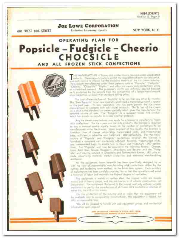 Joe Lowe Corp 1938 vintage ice cream ad Fudgicle Creamsicle Popsicle