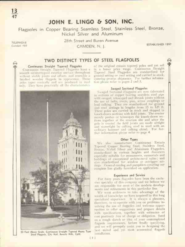 Original metal trade vintage catalog for JOHN E. LINGO & SON, INC. was located at 28th Street and Buren Avenue, Camden, NJ. Manufacturers of Continuous Straight Tapered Flagpoles, Swaged Sectional in Copper Bearing Seamless Steel, Stainless Steel, Bronze, Nickel Silver and Aluminum. Shown is the flagpole at City Hall, Beverly Hills, California. Unbound from a large 1938 architectural catalog, this unique old six page technical specifications brochure would display beautifully matted and framed. A fantastic addition to your retro metal library. Pages are detached and may contain a small amount of residual glue on edge.