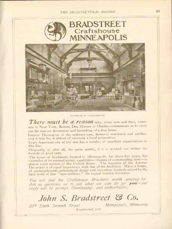 Original vintage architectural trade magazine ad for JOHN S. BRADSTREET AND COMPANY of Minneapolis, MN. Pictured is the Interior of the Bradstreet Craftshouse. Commissioned to carry out the interior decoration and furnishing of a fine home. Originality, great quality. Old 1911 interior decoration and design advertisement.