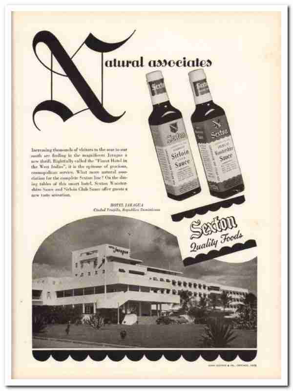 Original 1953 Greek-American business trade magazine vintage ad for JOHN SEXTON & COMPANY. Main office and plant was located in Chicago, IL. Natural Associates. Hotel Jaragua, of Ciudad Trujillo, Republica Dominicana, shown in photograph. On the dining tables of this smart hotel, Sexton Woostershire Sauce and Sirloin Club Sauce offer guests a new taste sensation.