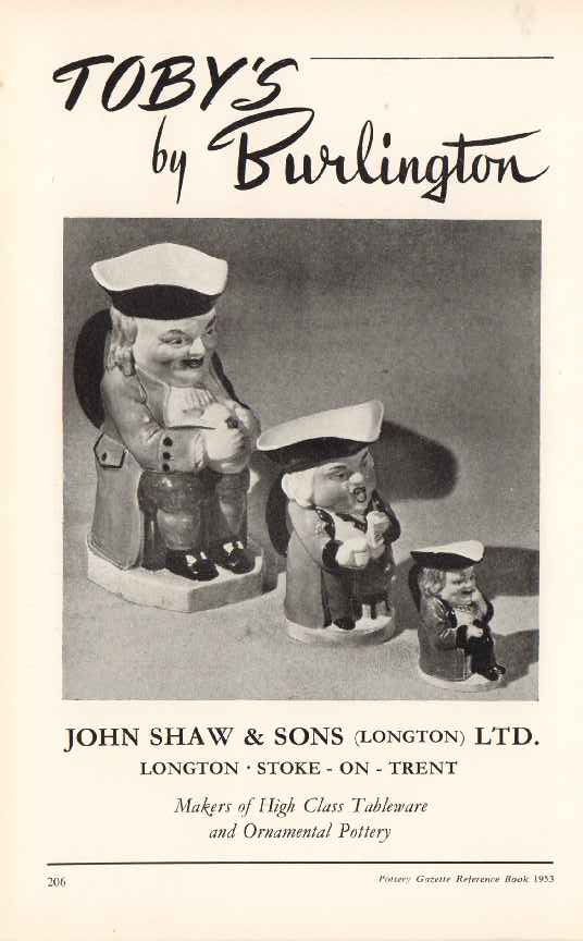 Original pottery vintage ad for JOHN SHAW AND SONS LTD. Toby's by Burlington. Makers of ornamental pottery and high class tableware.