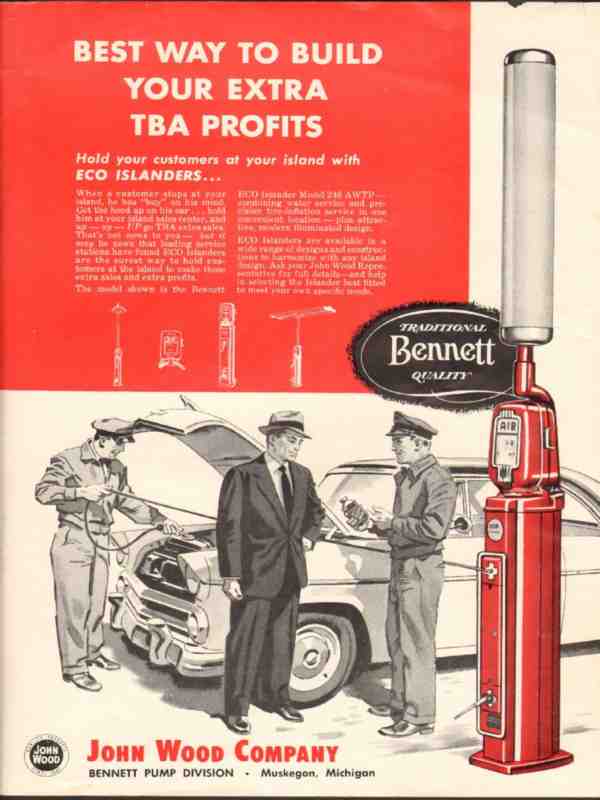 Original oil and gas service station industry trade magazine vintage ad for JOHN WOOD COMPANY of Muskegon, MI. Bennett Pump Division. The Best Way to Build Your Extra TBA Profits, Hold Your Customers at Your Island with ECO Islanders. Shown is Bennett ECO Islander Model 246 AWTP combining water service and precision tire inflation service in one convenient location, plus attractive, modern illuminated design. Old 1955 gasoline service station pump and equipment magazine advertisement.