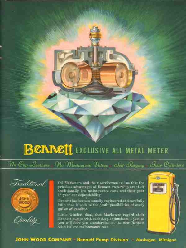 Original old oil and gas service station industry trade magazine vintage ad for JOHN WOOD COMPANY of Muskegon, MI. Bennett Pump Division. This is the View that Makes Sales for You. Bennett illuminated oil merchandiser is designed to match the other components on your island, put your oil display right under the drivers' eyes where it belongs. Ad is on the front and back sides. This 1955 petroleum magazine advertisement would display beautifully matted and framed.