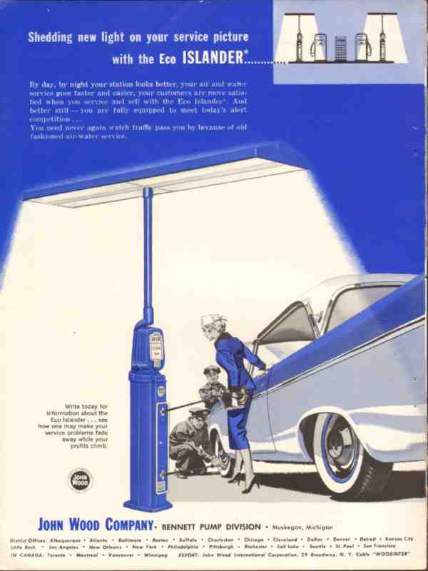 Original old service station lighting trade magazine vintage ad for JOHN WOOD COMPANY of Muskegon, MI. Eco Islander Shedding new light on your service picture. This unique 1956 2 sided gasoline and electrical equipment advertisement would display beautifully matted and framed.