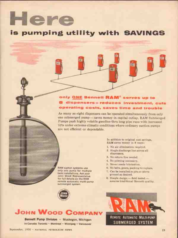 Original old retail service station trade magazine vintage ad for JOHN WOOD COMPANY of Muskegon, MI. Submerged Pumping Utility with Saving. RAM Remote Automatic Multi-Pump pushes highly volatile gasoline thru long pipe runs with increased lifts under extreme climatic conditions. Bennett Pump Division. This unique old 1956 oil and gas advertisement would display beautifully matted and framed.