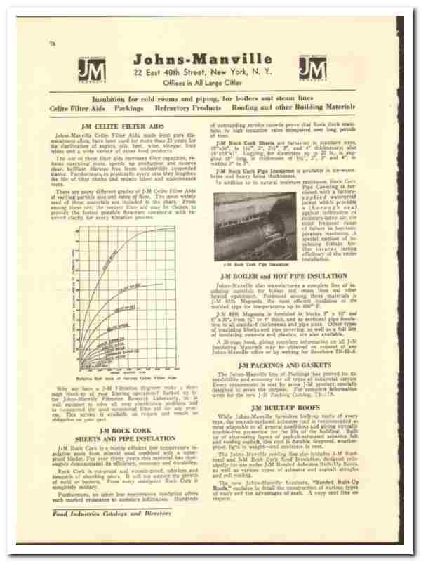 Products include J-M Celite Filter Aids, J-M Rock Cork Sheets & Pipe Insulation, J-M Boiler & Hot Pipe Insulation, J-M Packings & Gaskets and J-M Built-up Roofs, all are featured. Asbestos is mentioned in manufacturing.