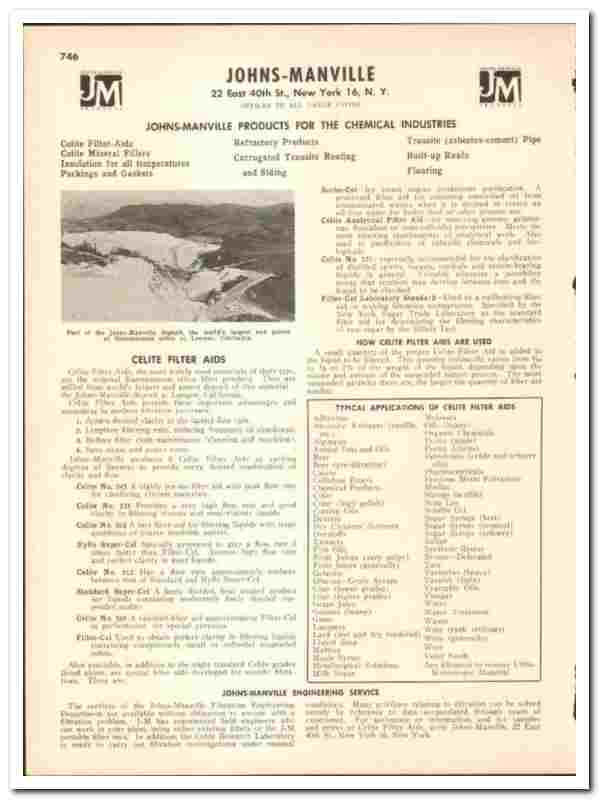 Products include Celite Filter Aids, Celite Mineral Fillers, Magnesia Pipe Insulation & Blocks, Superex Blocks & Pipe Insulation, Rock Cork Sheets & Pipe Insulation, Insulating Fire Bricks & Fireblok, Johns-Manville Firecrete, No. 60 Service Sheet Packing, Plastic Coil Packing, Asbestos Fiber Sheet Packing, Centripac Rod Packing, Caustic-Resisting Rod Packing, Acid-Resisting Rod Packing, Transite Industrial Vent Pipe, Transite Pressure Pipe, Industrial Building Materials, Flexstone Roofs, Asphalt Tile Flooring and Chemstone, all are fully featured.
