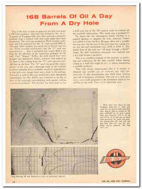 Original oil and gas trade magazine vintage ad for JOHNSTON TESTERS, INC. of Houston, TX.  A. C. Torgeson got 168 barrels of oil a day from dry hole in Weld County, Colorado.  The consulting geologist on the well, Paul Skipper Keller, ran a Drill Stem Test from Johnston Testers. Torgeson Oils realized a successful producer from a wildcat well that could easily have been abandoned. This unique 1959 old oilfield petroleum drilling industry magazine advertisement would display beautifully matted and framed.
