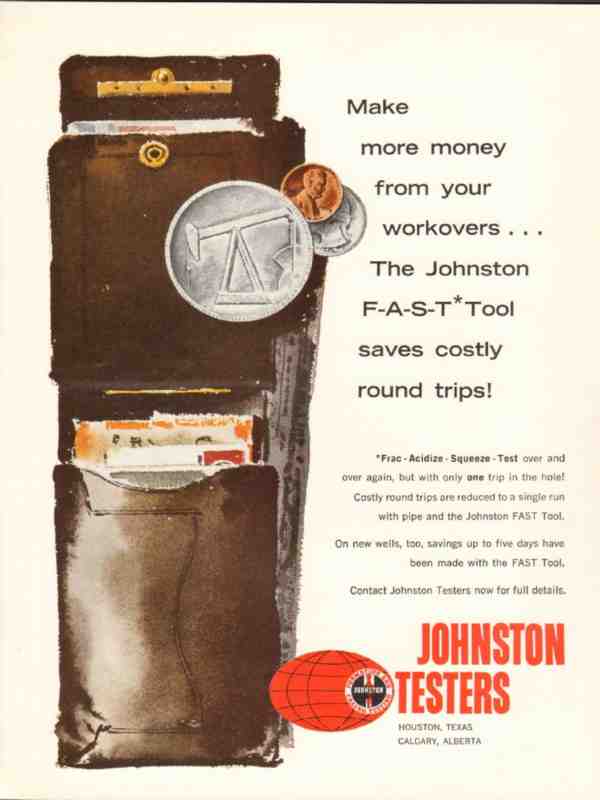 Original oil and gas trade magazine vintage ad for JOHNSTON TESTERS, INC. of Houston, TX. Make More Money From Your Workovers. The Johnston FAST Tool Saves Costly Round Trips! Frac-Acidize Squeeze Test. This unique 1962 old oilfield petroleum drilling industry magazine advertisement would display beautifully matted and framed. Great graphics.