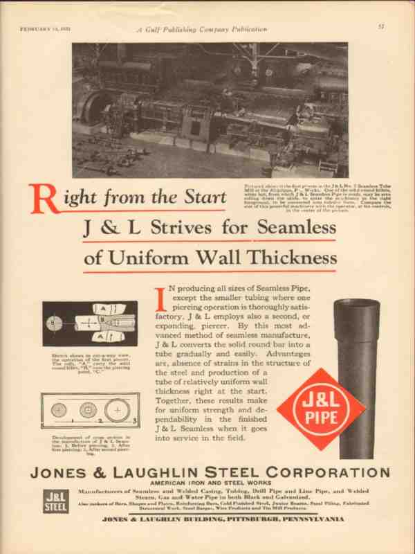 Original oil and gas trade magazine vintage ad for JONES & LAUGHLIN STEEL CORPORATION, was located in the Jones & Laughlin Building, Pittsburgh, PA. Right from the Start J and L Strives for Seamless of Uniform Wall Thickness. Pictured is the J & L No. 2 Seamless Tube Mill at the Aliquippa, PA Works. This unique 1931 old oilfield petroleum drilling pipe and tubing magazine advertisement would display beautifully matted and framed. Nice graphics.