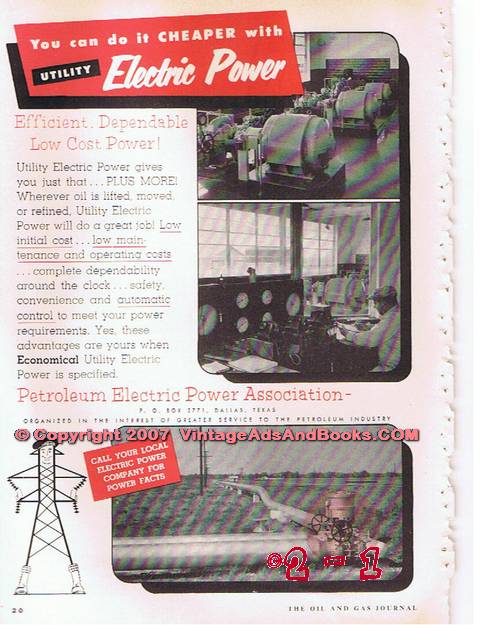 Original oil and gas trade magazine vintage ad for JONES & LAUGHLIN STEEL CORPORATION of Tulsa, OK. Supply Division. Cabot Pumping Units Get Better All The Time! Old 1955 old oilfield petroleum pumping industry magazine advertisement. On the reverse side is an ad for PETROLEUM ELECTRIC POWER ASSOCIATION of Dallas, TX. You Can Do It cheaper With Utility Electric Power. Efficient, Dependable Low Cost Power! Unique 1955 old petroleum industry equipment magazine advertisement. Approximate page size 9 x 12 inches.