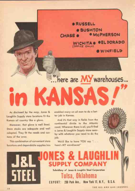 Original oil and gas trade magazine vintage ad for JONES & LAUGHLIN SUPPLY COMPANY of Tulsa, OK. My Warehouse in Kansas. Russell, Bushton, Chase, McPherson, Wichita, El Dorado, Winfield. Store locations fit the Kansas oil country like a glove that is well lined. This unique 1950 old oilfield petroleum pipe industry equipment magazine advertisement would display beautifully matted and framed. Nice graphics.