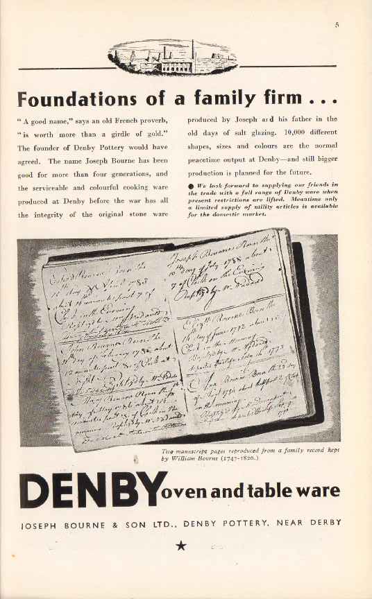 Original pottery vintage ad for JOSEPH BOURNE SON LTD. Denby Oven and Table Ware, foundations of a family firm. Made for more than four generations, the serviceable and colorful cooking ware produced before the war has all the integrity of the original stone ware produced by Joseph and his father in the old days of salt glazing. We look forward to supplying our friends in the trade with a full range of Denby ware when the present post-war restrictions are lifted.