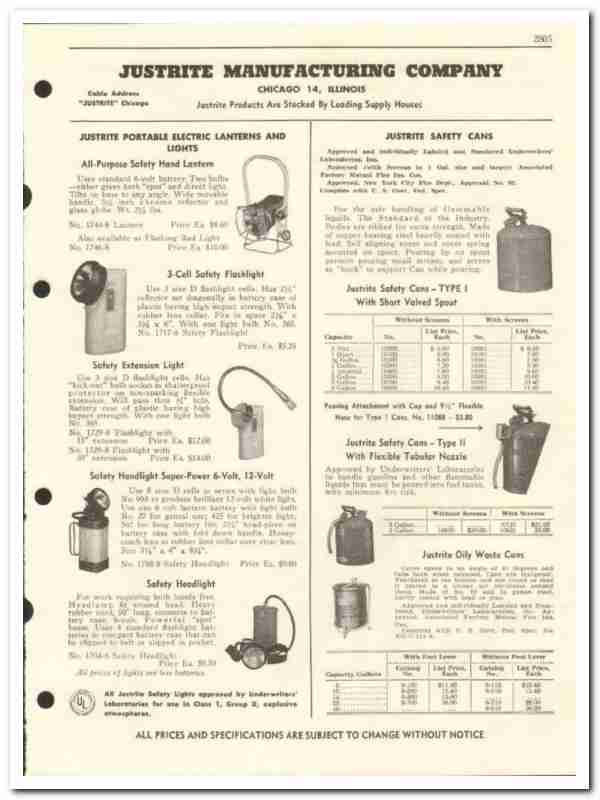 Products include All-Purpose Safety Hand Lantern, 3-Cell Safety Flashlight, Safety Extension Light, Safety Handlight Super-Power 6-Volt and 12-Volt, Safety Headlight, Justrite Safety Cans Type I with Short Valved Spout, Justrite Safety Can Type II with Flexible Tubular Nozzle and Justrite Oily Waste Cans are all featured.