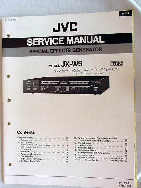 Soft covered book titled JVC SERVICE MANUAL SPECIAL EFFECTS GENERATOR Model JX-W9. This original manual is in VG condition. 40 pages are clean and intact. There is some writing on the cover.