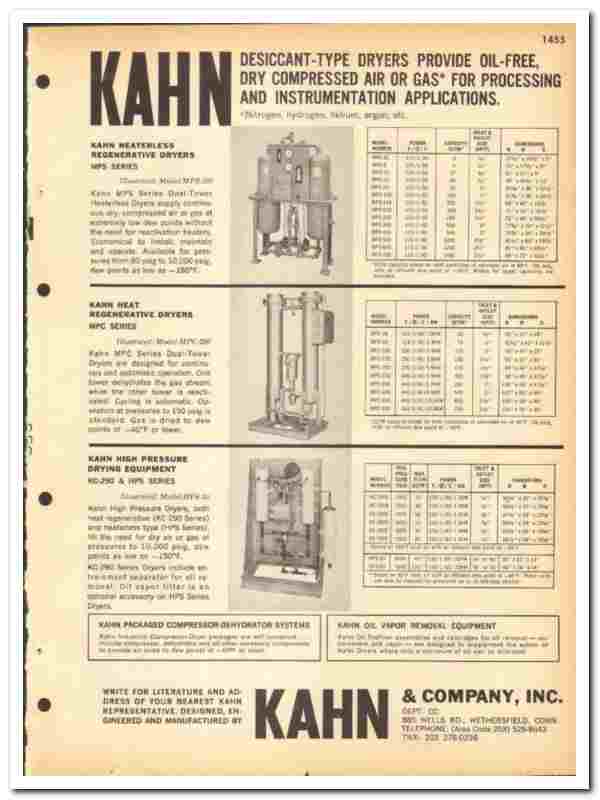 Products include Kahn Heaterless Regenerative Dryers, Kahn Heat Regenerative Dryers, Kahn High Pressure Drying Equipment and Kahn Packaged Compressor-Dehydrator Systems, all are fully featured.