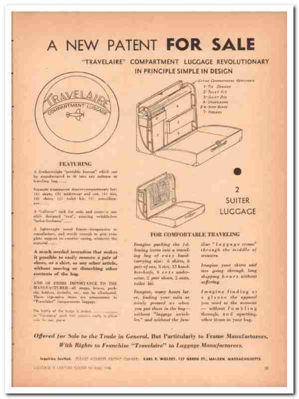 Karl V Wolsey 1946 Vintage Ad Luggage Patent For Sale Travelaire