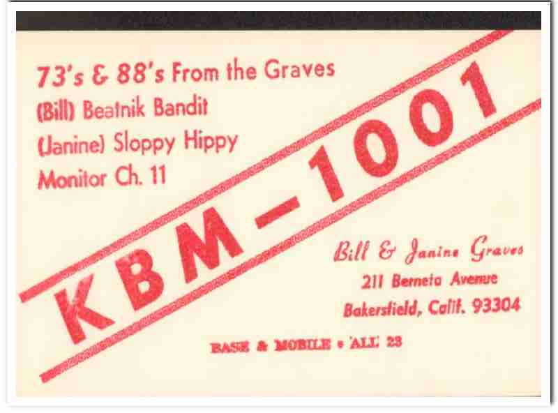 Original QSL postcard from the mid to late 1960s.This unused card was sent from CB radio station: KBM-1001. Was issued to Janine and Bill Graves, at 211 Berneta Avenue, Bakersfield, California. His CB handle was Beatnik Bandit, and her CB handle was Sloppy Hippy. 73s and 88s Fron The Graves. During the 1920s and 1930s, amateur ham radio operators adopted the practice of two-way exchanging of QSL postcards, to confirm their radio contact, with a report of reception. QSL cards got to be known as wallpaper, commonly used to decorate the walls of their radio equipment room. During the 1960s, CB citizen band radio became popular, and the practice of exchanging QSL cards to confirm radio contacts was enjoyed by many with this new hobby. Today, these cards are very collectible and look great matted and framed.