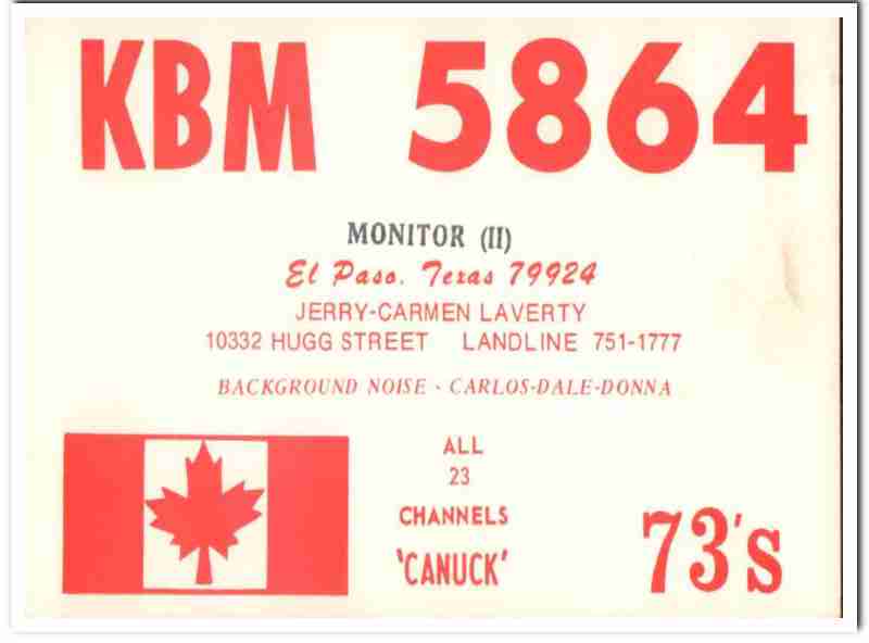 Original QSL postcard from the mid to late 1960s. This card was sent from CB radio station: KBM-5864. Was issued to Carmen and Jerry Laverty, at 10332 Hugg Street, El Paso, Texas. Handle was Canuck. Kids names Carlos, Dale and Donna. During the 1920s and 1930s, amateur ham radio operators adopted the practice of two-way exchanging of QSL postcards, to confirm their radio contact, with a report of reception. QSL cards got to be known as wallpaper, commonly used to decorate the walls of their radio equipment room. During the 1960s, CB citizen band radio became popular, and the practice of exchanging QSL cards to confirm radio contacts was enjoyed by many with this new hobby. Today, these cards are very collectible and look great matted and framed.