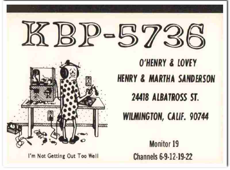 Original QSL postcard from the mid to late 1960s.This unused card was sent from CB radio station: KBP-5736. Was issued to Martha and Henry Sanderson, at 24418 Albatross Street, Wilmington, California. His CB handle was OHenry and her CB handle was Lovey. During the 1920s and 1930s, amateur ham radio operators adopted the practice of two-way exchanging of QSL postcards, to confirm their radio contact, with a report of reception. QSL cards got to be known as wallpaper, commonly used to decorate the walls of their radio equipment room. During the 1960s, CB citizen band radio became popular, and the practice of exchanging QSL cards to confirm radio contacts was enjoyed by many with this new hobby. Today, these cards are very collectible and look great matted and framed.