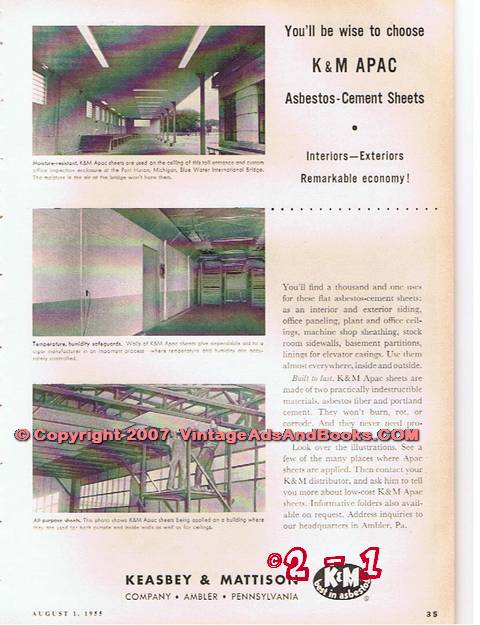 Original vintage oil and gas magazine ad, KEASBEY & MATTISON COMPANY, of Ambler, PA. K & M Asbestos Cement Sheets. Built to last. K & M Apac Sheets are made of two practically indestructible materials, asbestos fiber and portland cement. Pictured are the Apac sheets used on the ceiling of the toll entrance and custom office inspection enclosure at the Port Huron, MI, Blue Water International Bridge. K & M Best In Asbestos. Old 1955 petroleum industry advertisement.
