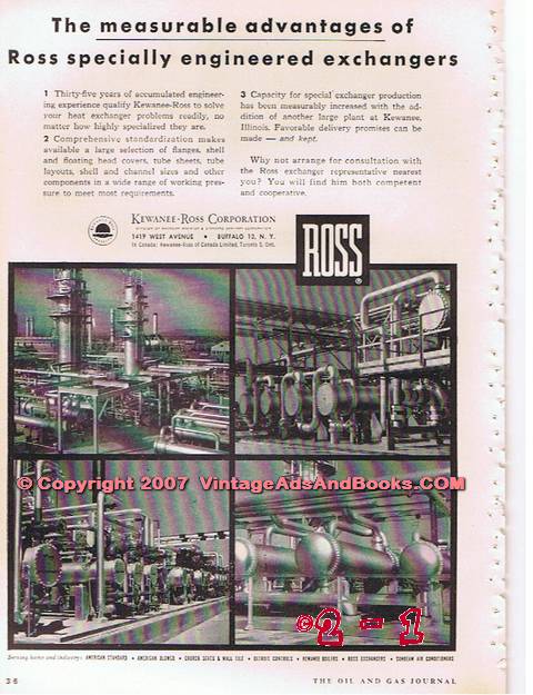 On the reverse side (see Additional Images tab) is KEWANNEE-ROSS CORPORATION of Buffalo, NY. The measurable Advantages of Ross Specially Engineered Exchangers. American-Standard, American Blower, Church Seats & Wall Tile, Detroit Controls, Kewanee Boilers, Ross Exchangers, Sunbeam Air Conditioners. Old 1955 petroleum industry equipment advertisement.