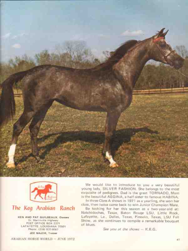 Original old equestrian trade magazine vintage ad for KEG ARABIAN RANCH in Lafayette, LA. Silver Fashion, sire Tornado, dam Aegina. Half sister to Havina. Ken and Pat Guilbeaux owners, Joe Major, trainer. This unique 1972 Arabian horse breeding advertisement would display beautifully matted and framed.